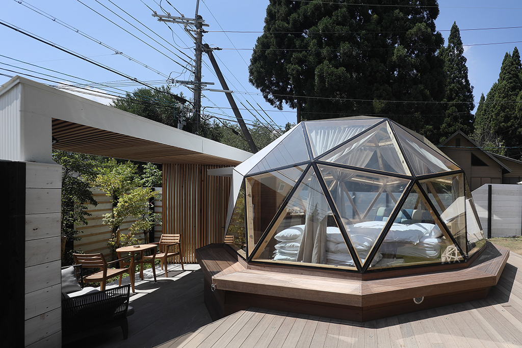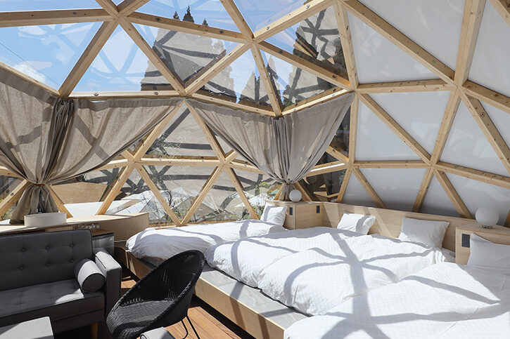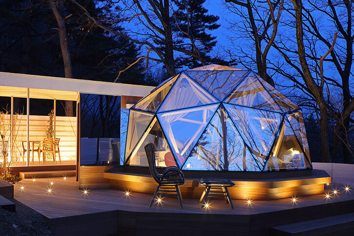 直径5メートルの全面ガラス張りドーム棟と、室内にシャワー・トイレを備えたユーティリティ棟で構成された「Dome Koti 504S」。